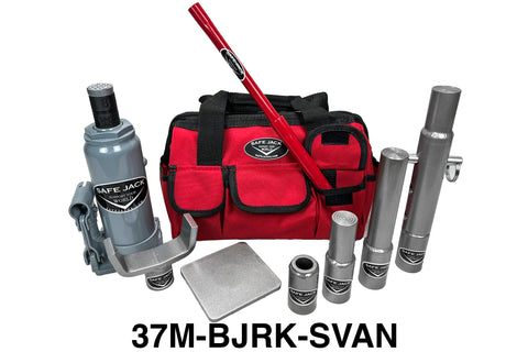 The kit also includes the 37M-BJRK-8W Recovery Kit, featuring an 8-ton Pro-Lift bottle jack and all essential Safe Jack components for dependable operation. Everything comes neatly organized in a durable red Safe Jack canvas zippered bag.